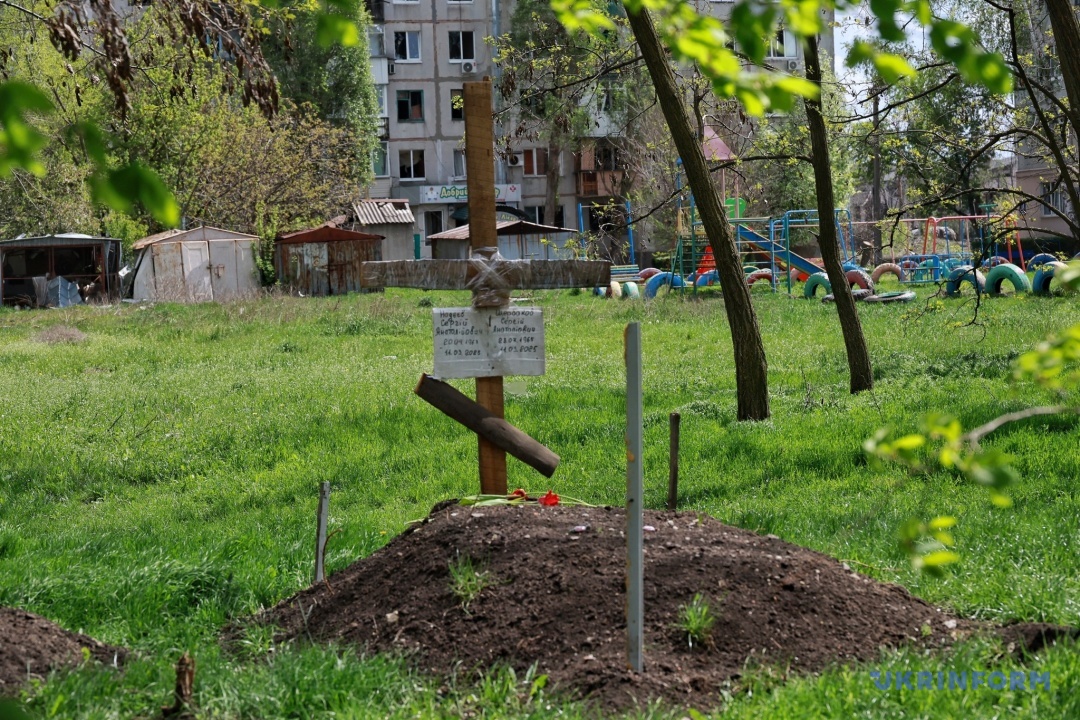 中庭の1つで、新しい墓を見かけた。住民たちは、ここには3月に亡くなった男性たちが埋められていると述べる。隣人が彼らを埋めたのだという。