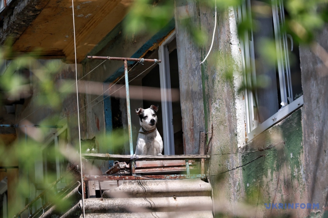 もう1軒の壊れた5階建ての集合住宅を通り過ぎる。それは「死んだ」建物のように思える。しかし、そこで犬の鳴き声が聞こえた。ベランダに犬と猫がいる。入り口の近くには、バーベーキューセットがある。ここで人が暮らしている。