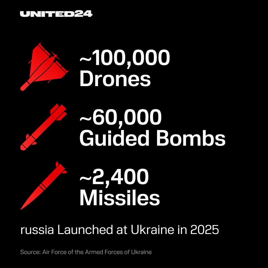 ウクライナへの全面侵略を続けるロシア軍は、2025年の1年間で、ウクライナに対して10万機以上の無人機、6万弾の滑空爆弾、約2400弾のミサイルで攻撃を仕掛けた。
