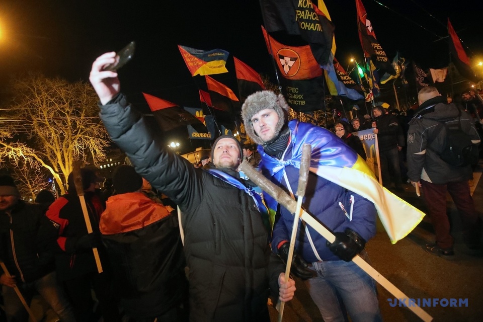 1日、キーウ(キエフ)市中心部にて、ウクライナ民族主義者組織(OUN)の指導者ステパン・バンデラの生誕111周年に合わせた「たいまつ行進」が行われた。