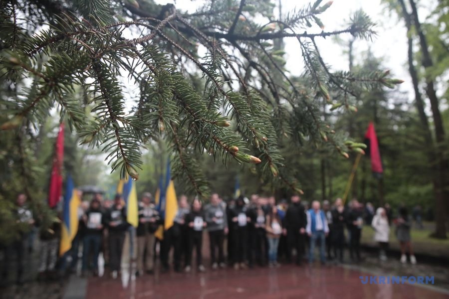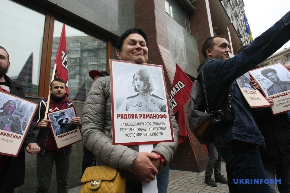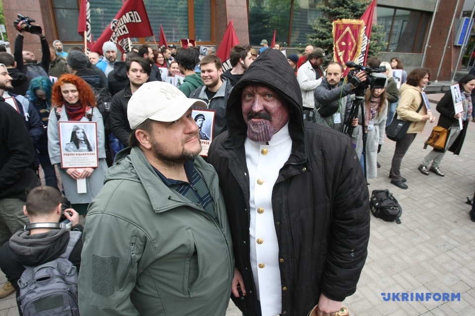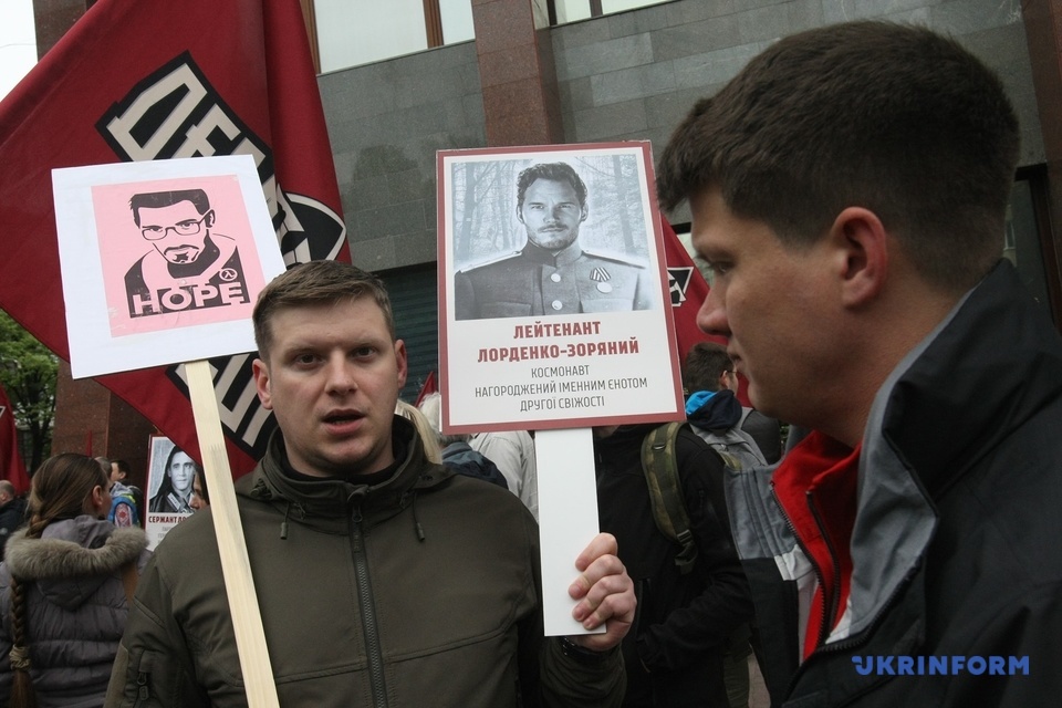 「民主的な斧」の参加者たちは、交通大学近くに集まり「不死の連隊」行進が通常用いる戦死者肖像を模した、様々なキャラクターの肖像画を掲げて「民族に栄光を、敵に死を」と叫び、ウクライナの民謡などを歌った。