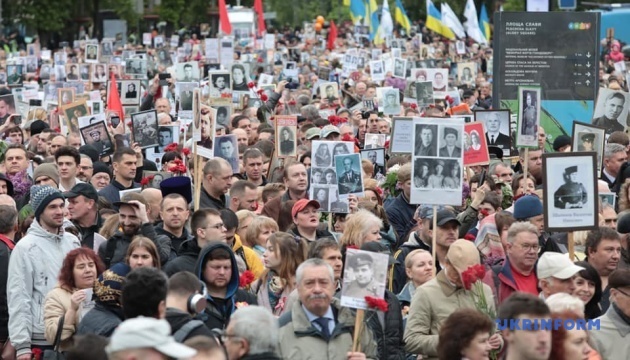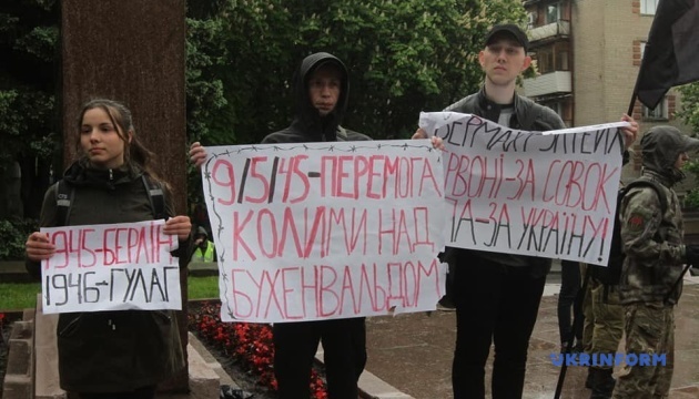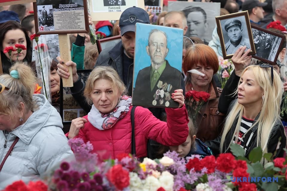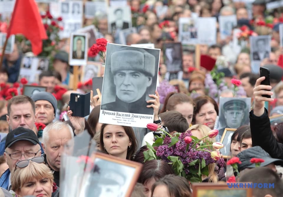 ウクライナ国旗を掲げた愛国主義団体の活動家は、ウクライナ国歌を歌ったり、民族主義的スローガンを唱えたりしていた。これに「不死の連隊」参加者から反ウクライナ的内容のスローガンが唱えられる場面が見られた。