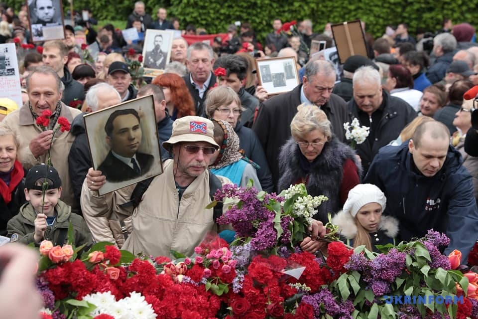 「不死の連隊」行進の参加者は、約2~3000名。参加者は、無名戦士の墓に向かって進み、「ファシズムは通さない」、「ドンバス、私たちはあなたと共にある」などのスローガンを唱えた。また、この行進に参加する活動家たちは、行進参加者に対し、「共産主義者は退治されよ」、「ソヴィエト連邦は、民族の牢獄だ」などと反論した。