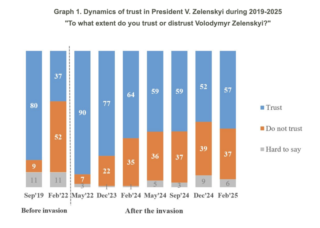 研究所は、ウクライナは、国際情勢やパートナー国・同盟国との関係をはじめ、深刻な挑戦とぶつかっていると氏的。その際の議論の一部はウクライナ大統領の「正統性」に関するものであるとし、それがあり得る「和平計画」の一部を構成する可能性が報じられていると指摘した(例えば、選挙を実施し、その後合意の内容を定めるなど)。他方で、ウクライナ社会では過半数が、選挙は戦後に行われるべきで、当面の優先課題は防衛能力の強化だと考えを維持し続けていると説明されている。同時に、重要なのは、大統領への信頼の水準だとも指摘されている。