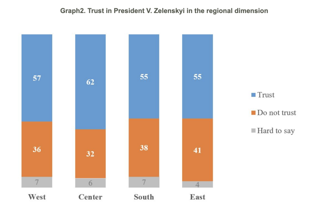 調査結果によれば、ゼレンシキー氏を「信頼する」と回答したのは57%、「信頼しない」と答えたのは37%だった。信頼と不信の差は+20%。