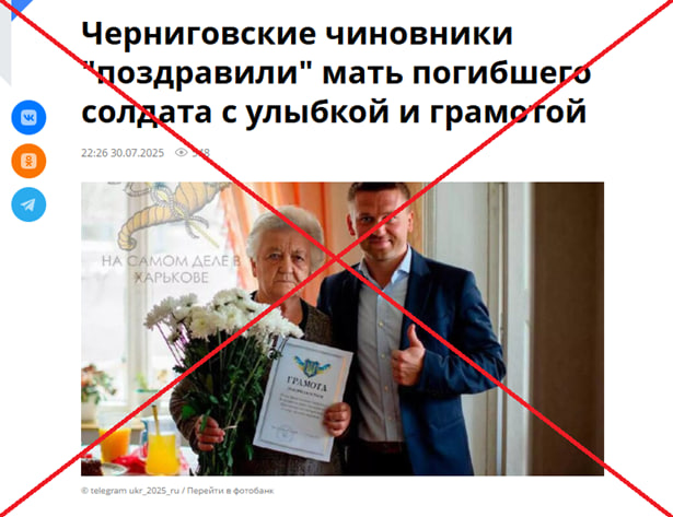 ロシアの報道機関とテレグラム・チャンネルは、スーツを着た男性が高齢の女性に花束と「感謝状」を渡している写真を拡散している。チェルニヒウ市議会が発行したとされるこの「感謝状」には、その女性があたかも「英雄を育てた功績(死後)」で表彰されたと書かれている。ニュースや投稿では、このようにウクライナでは戦死した息子に対し普通の感謝状しか贈られないとし、戦死した兵士とその家族に対する政権代表者たちの無関心を示すものだなどと主張されている。