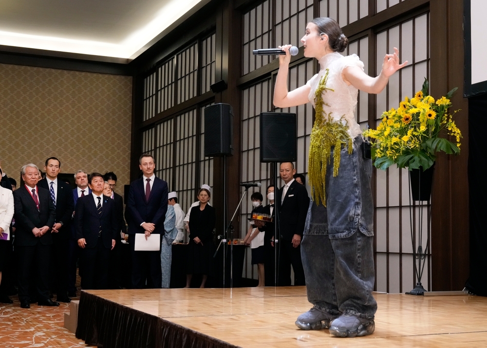 外務省が公開した写真では、ジェリー・ヘイルさんが茂木日本外相やソボレウ宇経済・環境・農業相たちの前で曲を披露している姿が見られる。