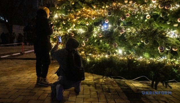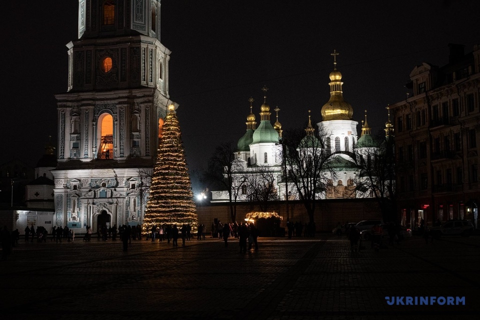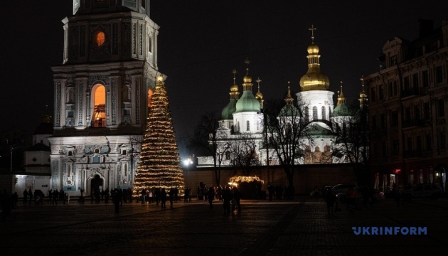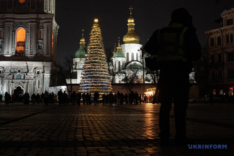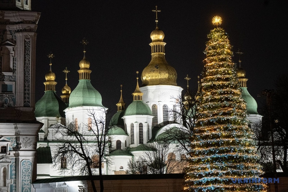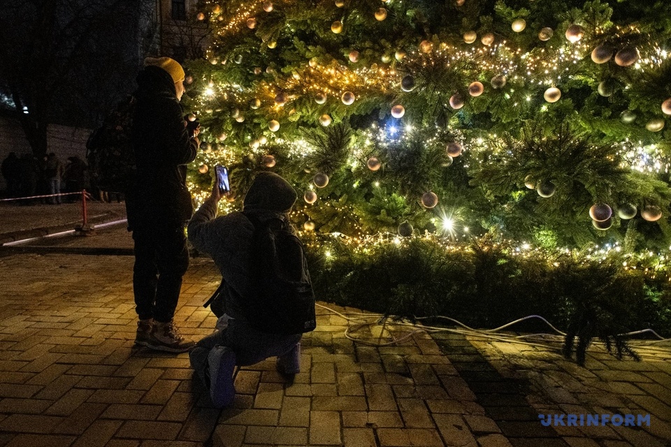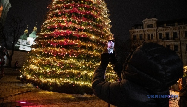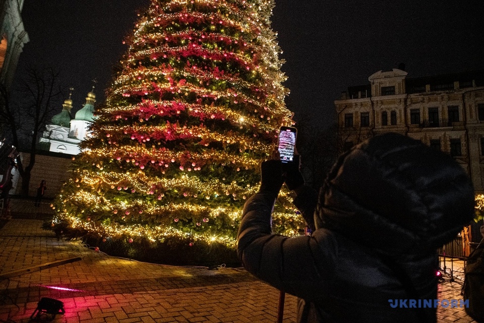 ウクライナ首都キーウでは5日、中心部のソフィア広場に、12月6日の聖ミコライの日を前に大型クリスマス・ツリーが点灯された。