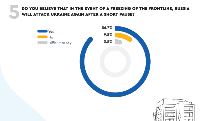 結果では、「前線凍結の場合にロシアは短期間の休止の後で再びウクライナを侵攻すると思うか」との設問に対して、回答者の86.7%が「そう思う」と回答。回答者のわずか9.5%のみが、凍結がより長期的な平和を確保する可能性があると予測した。