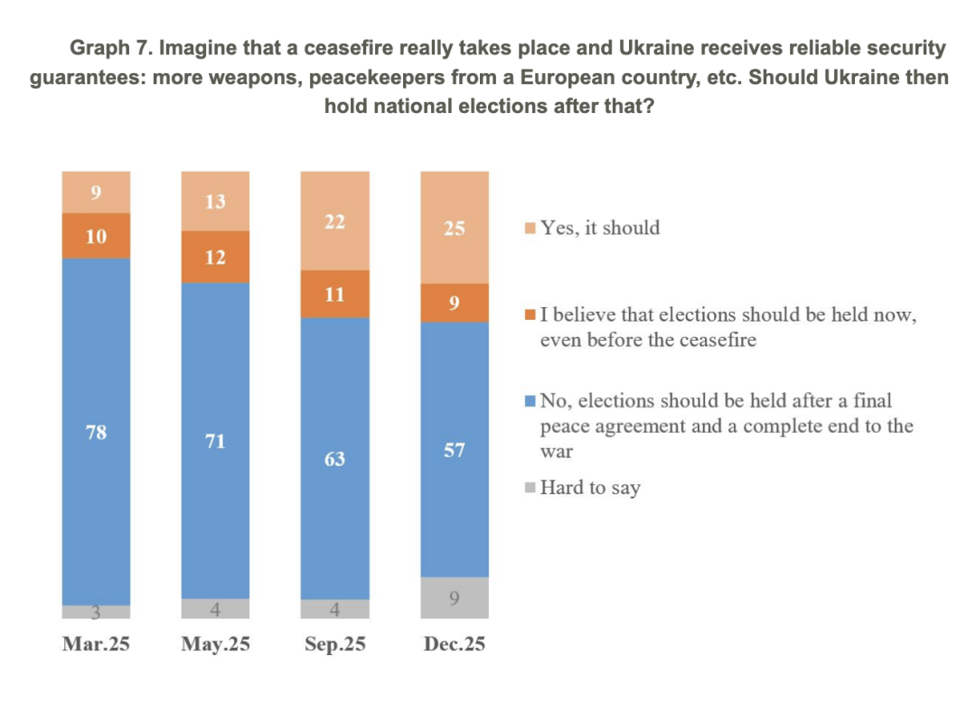 同時に、過半数の回答者(57%)は、選挙は最終的な和平協定締結と戦争の完全な終結後にのみ可能であると引き続き主張している(9月調査時は63%)。