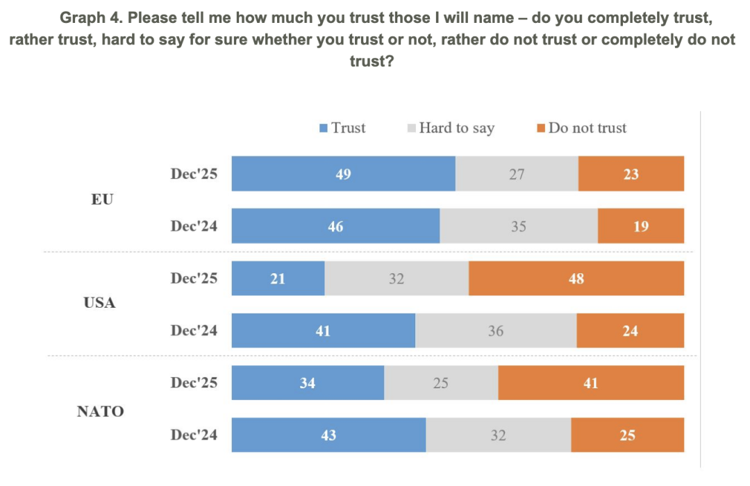 ウクライナで実施された最新の世論調査では、49%の回答者が欧州連合(EU)を信頼すると回答した。一方で、米国を信頼すると回答したのは21%だけだった。