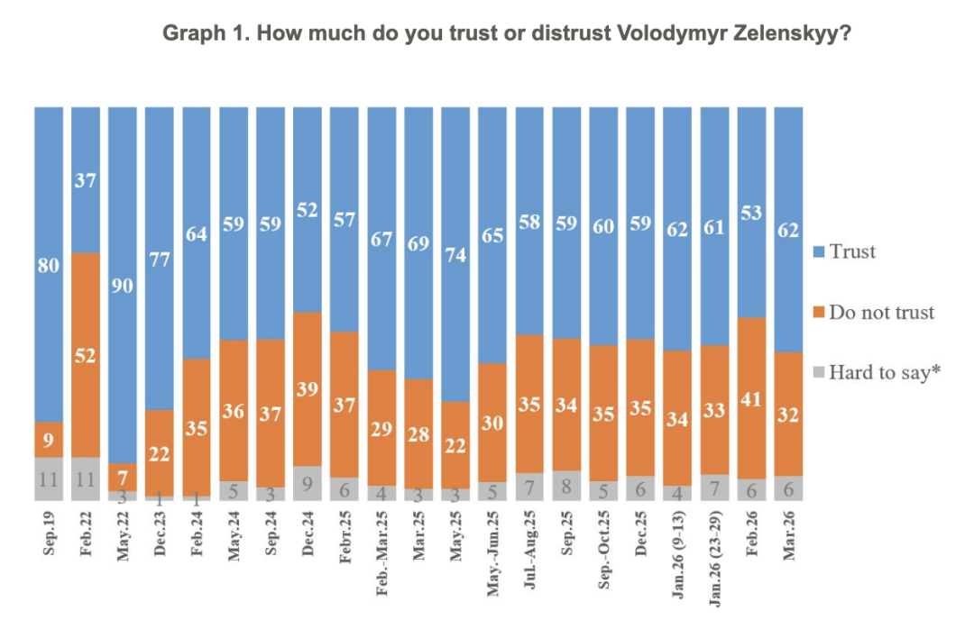 ゼレンシキー氏への信頼は62%、不信は32%で、その差は+30%となっている。
